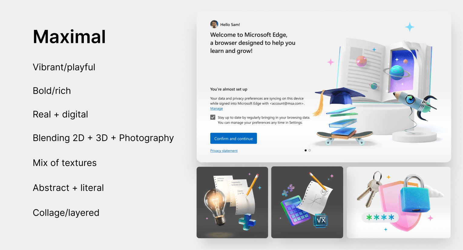 The studio's established language for illustration was called Maximal, which was intended to add expression and delight to our web experiences. It was defined by the following characteristics: