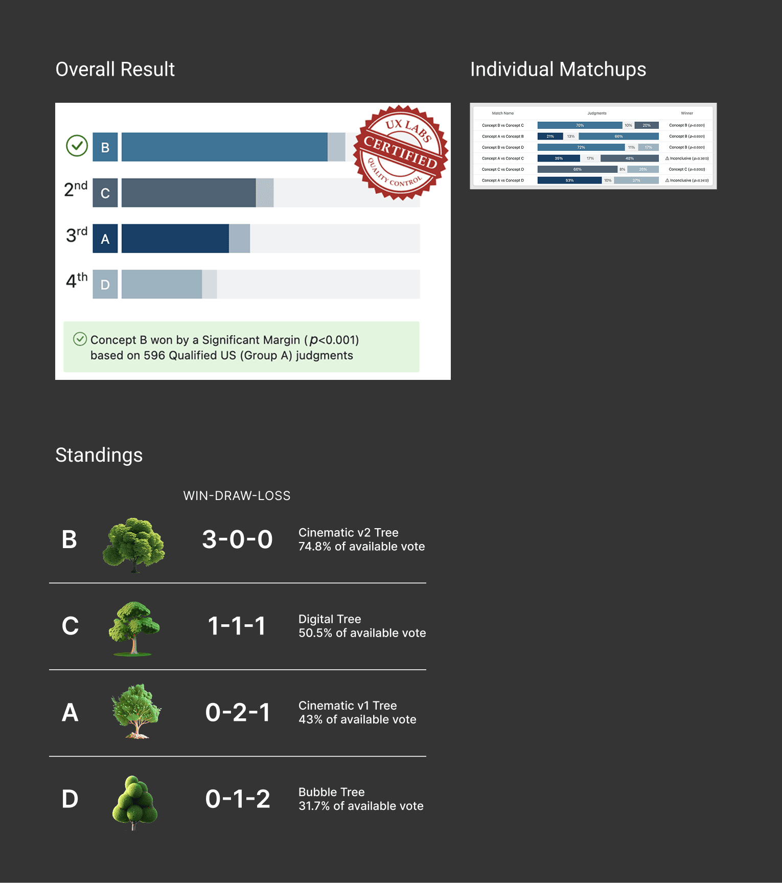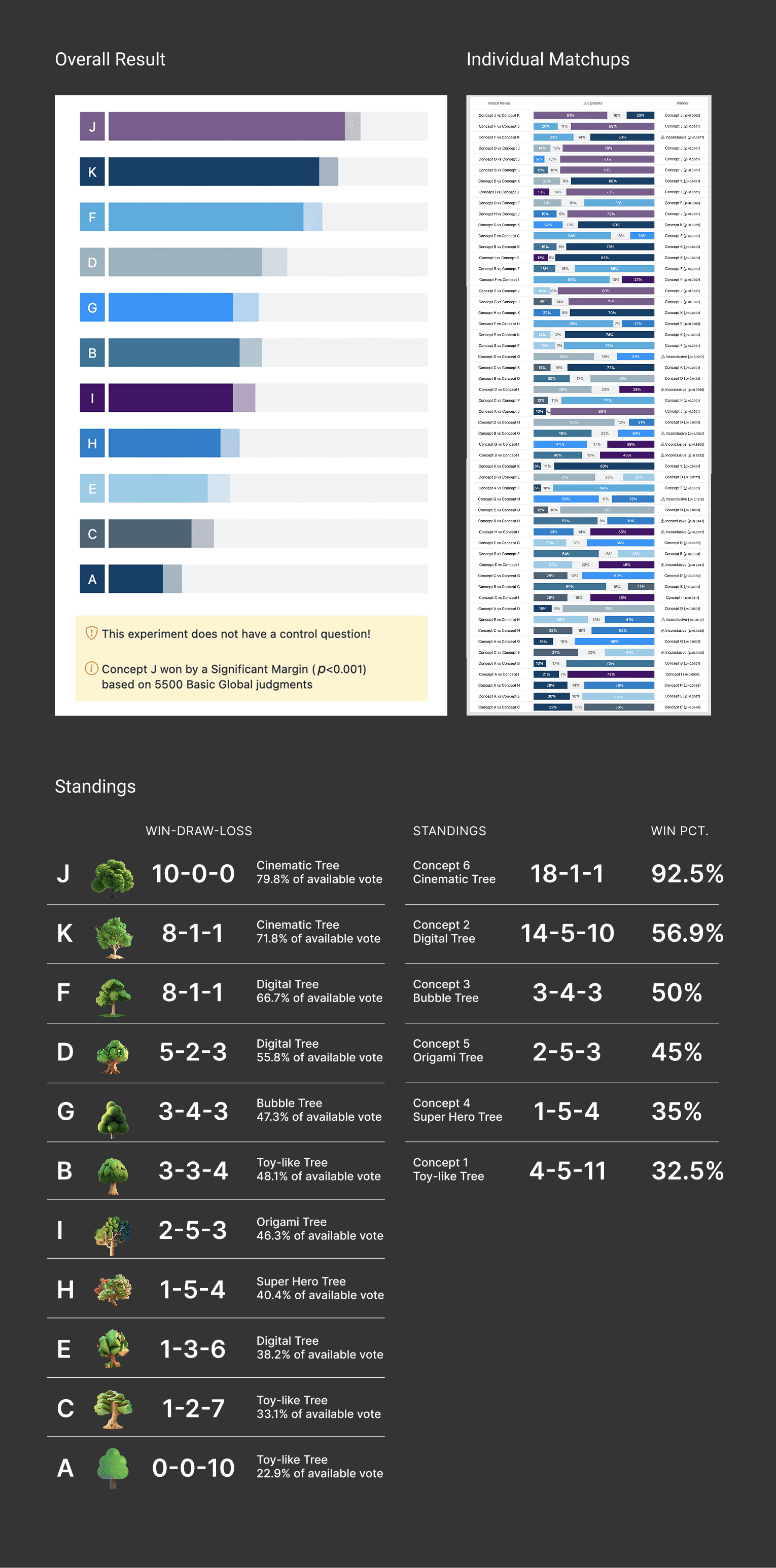 The team used an internal tool for user research studies to run side-by-side tests across a global pool of thousands of judges, assessing the judge's preference on the visual direction of the tree.