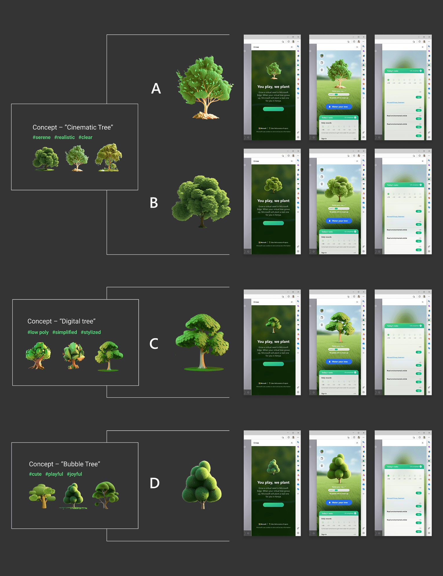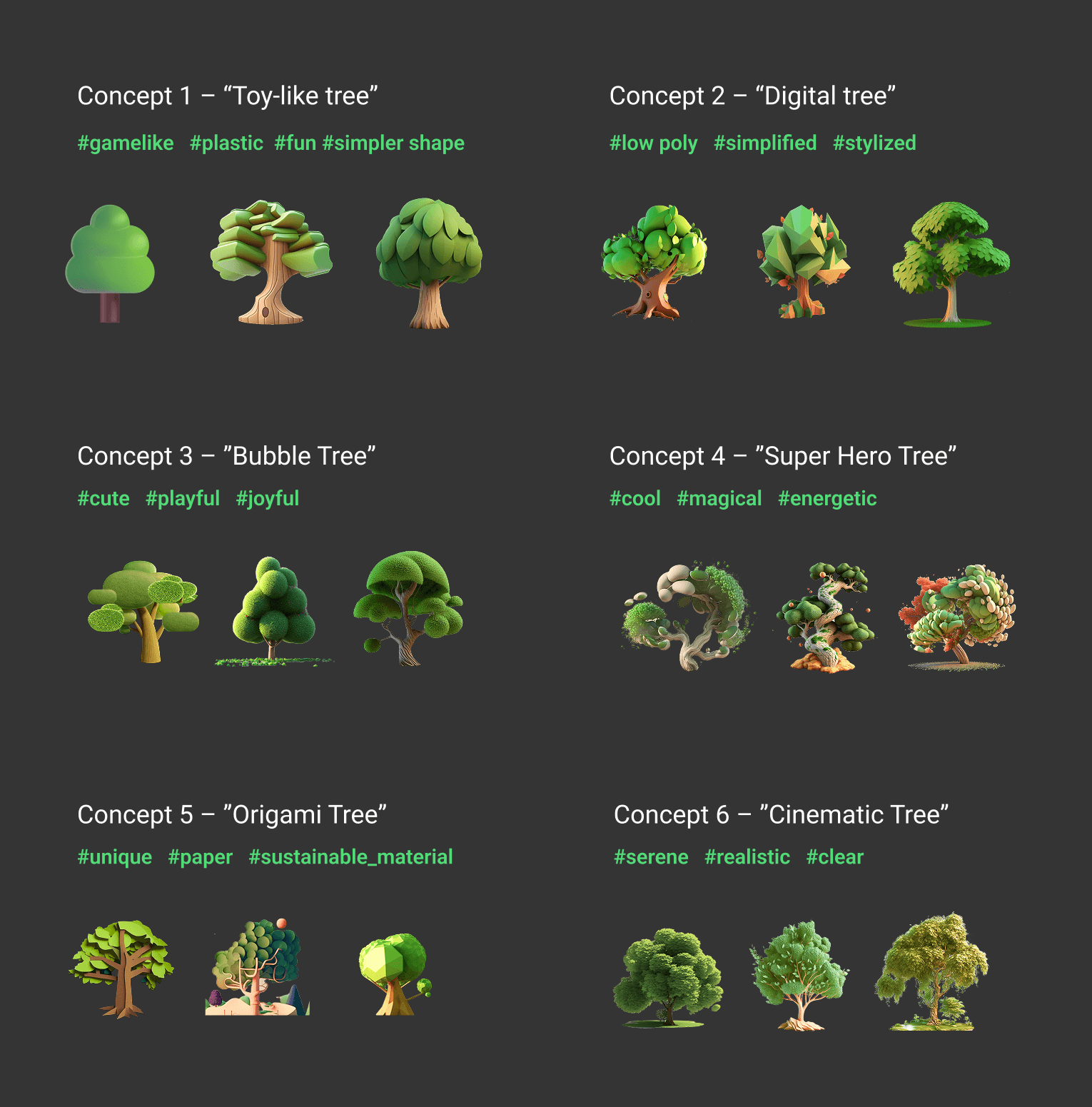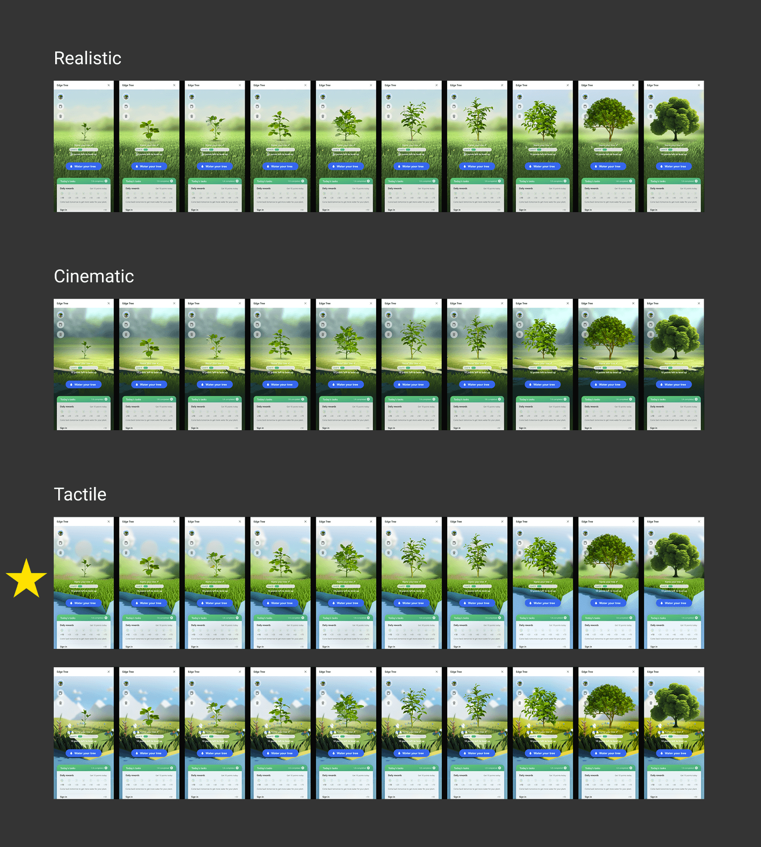 Based on the results from the user studies, we proceeded with the "Cinematic" concept by iterating on the design of the tree and how it would scale to all stages of the tree growing process.