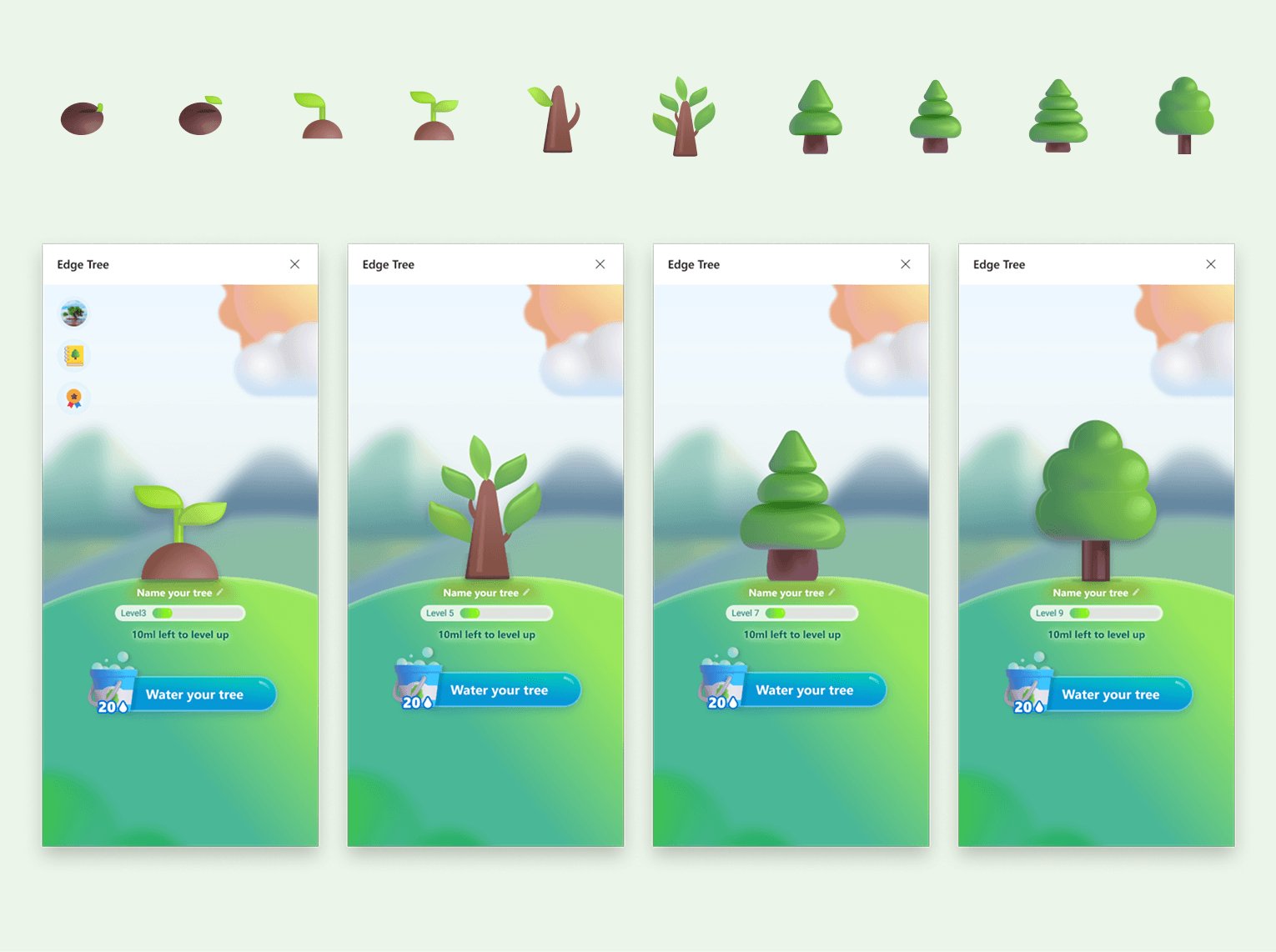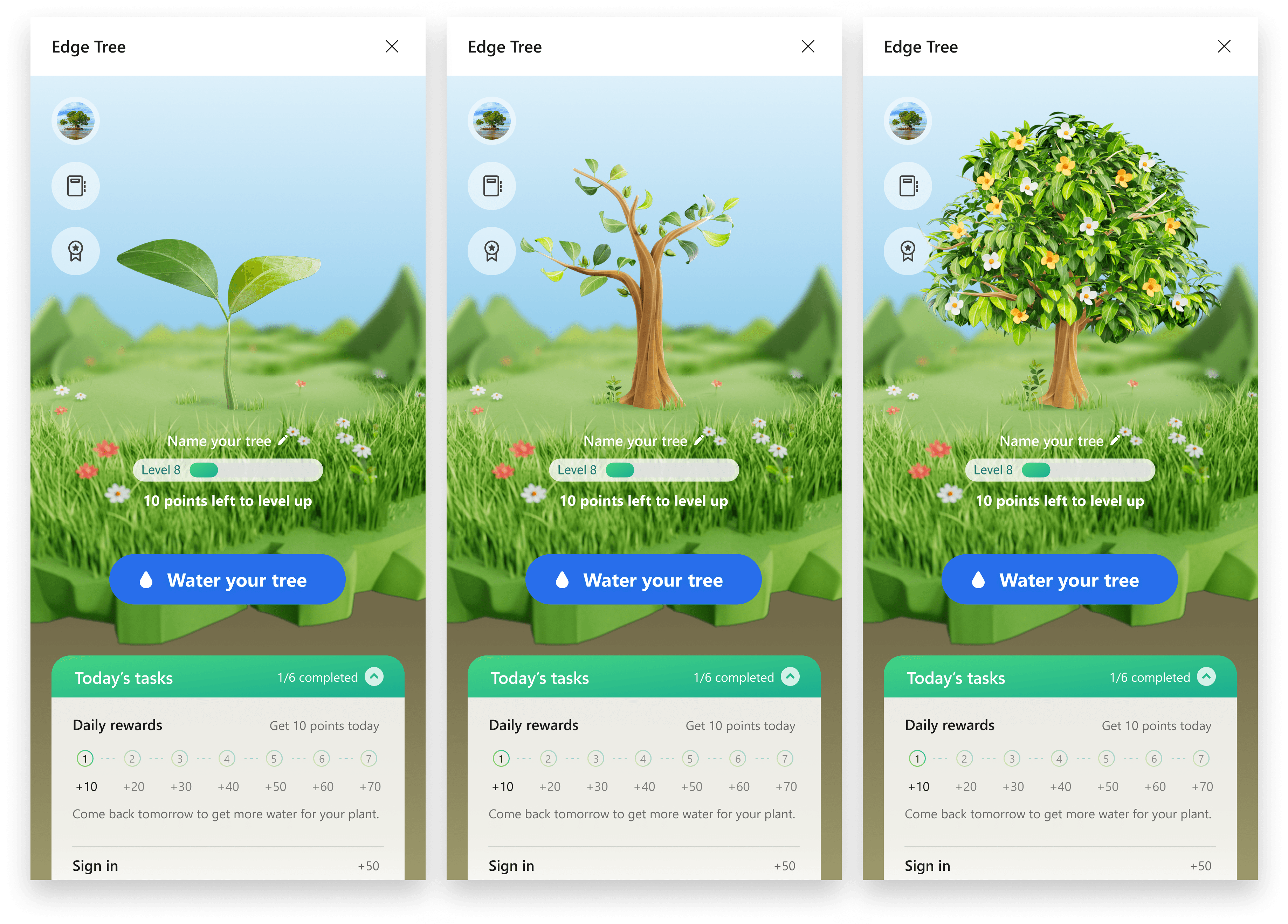 The E-Tree feature was a program within MSN Weather where users could earn points by completing daily tasks within MSN. These points then contributed to growing a virtual tree. Once a user's virtual tree reached level 10, Microsoft would partner with the non-profit Eden Reforestation Projects to plant a real tree on the user's behalf, which focused on restoring degraded mangrove forests in Kenya. This was a gamified rewards experience that also contributed to Microsoft's values around sustainability and environmental causes.