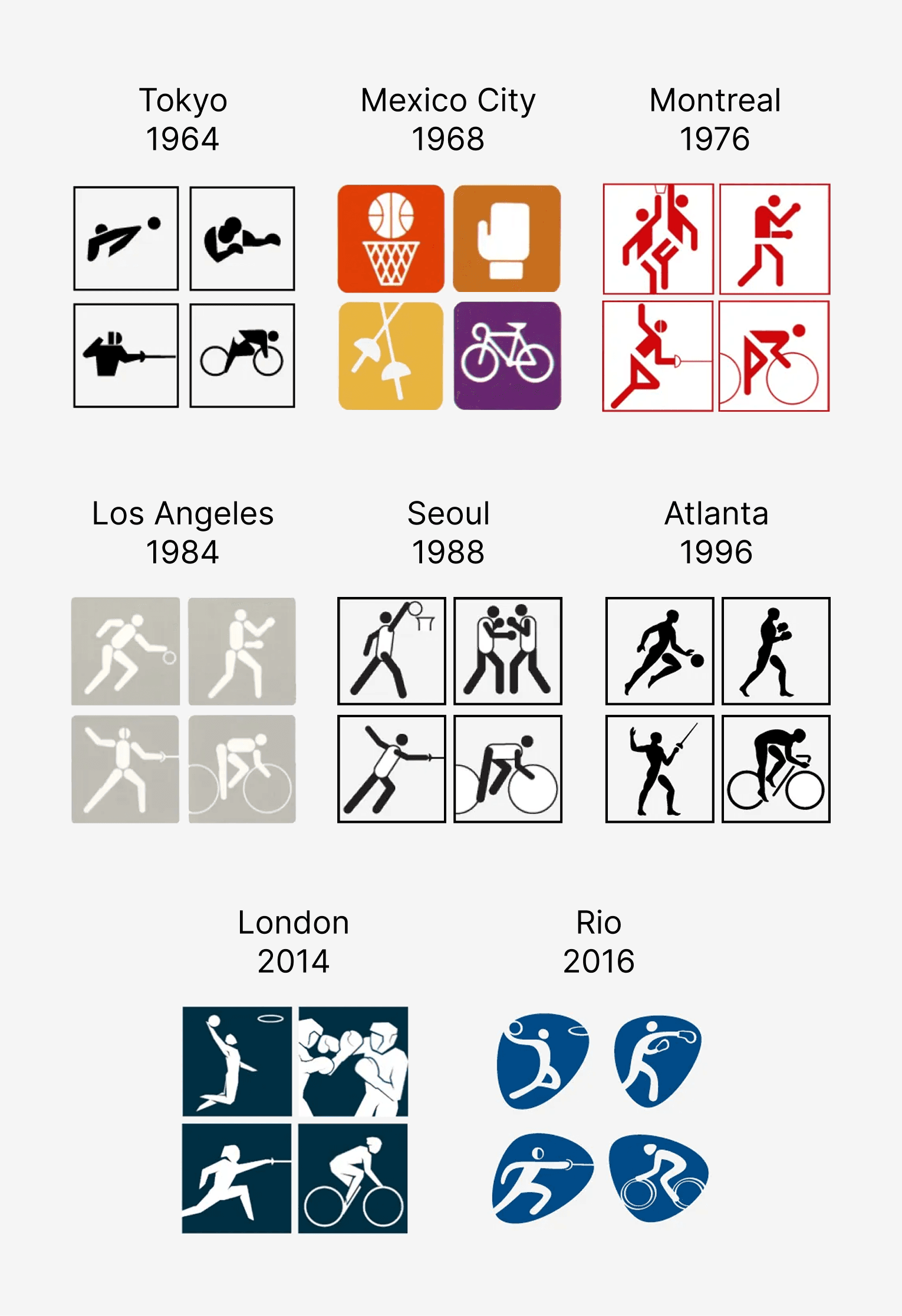 To begin this project, I went back to research the icon design of previous Summer Olympics, from the more utilitarian aesthetics of Tokyo, Montreal, and Munich, to the more expressive icon languages created for the events in London and Rio.