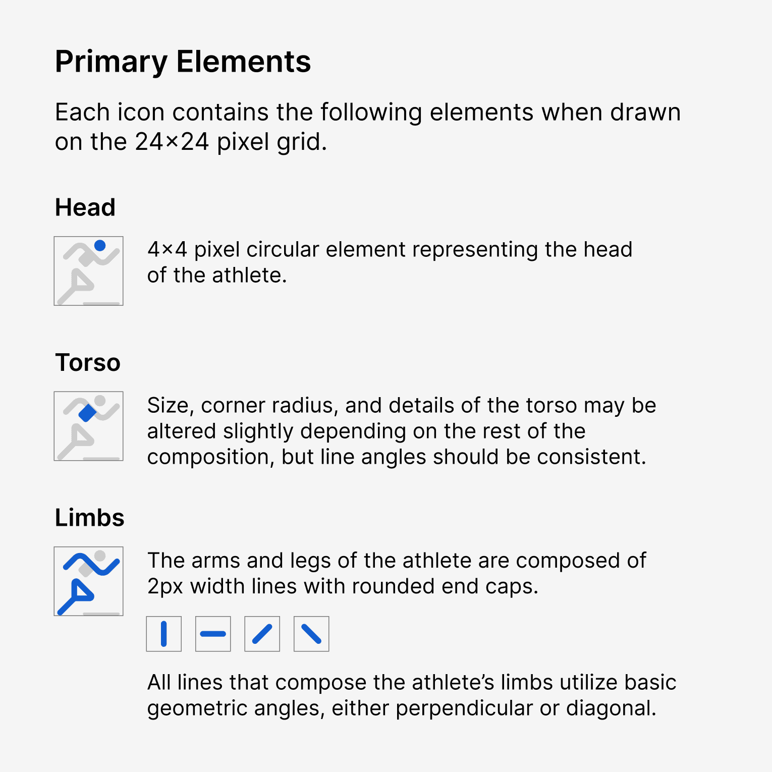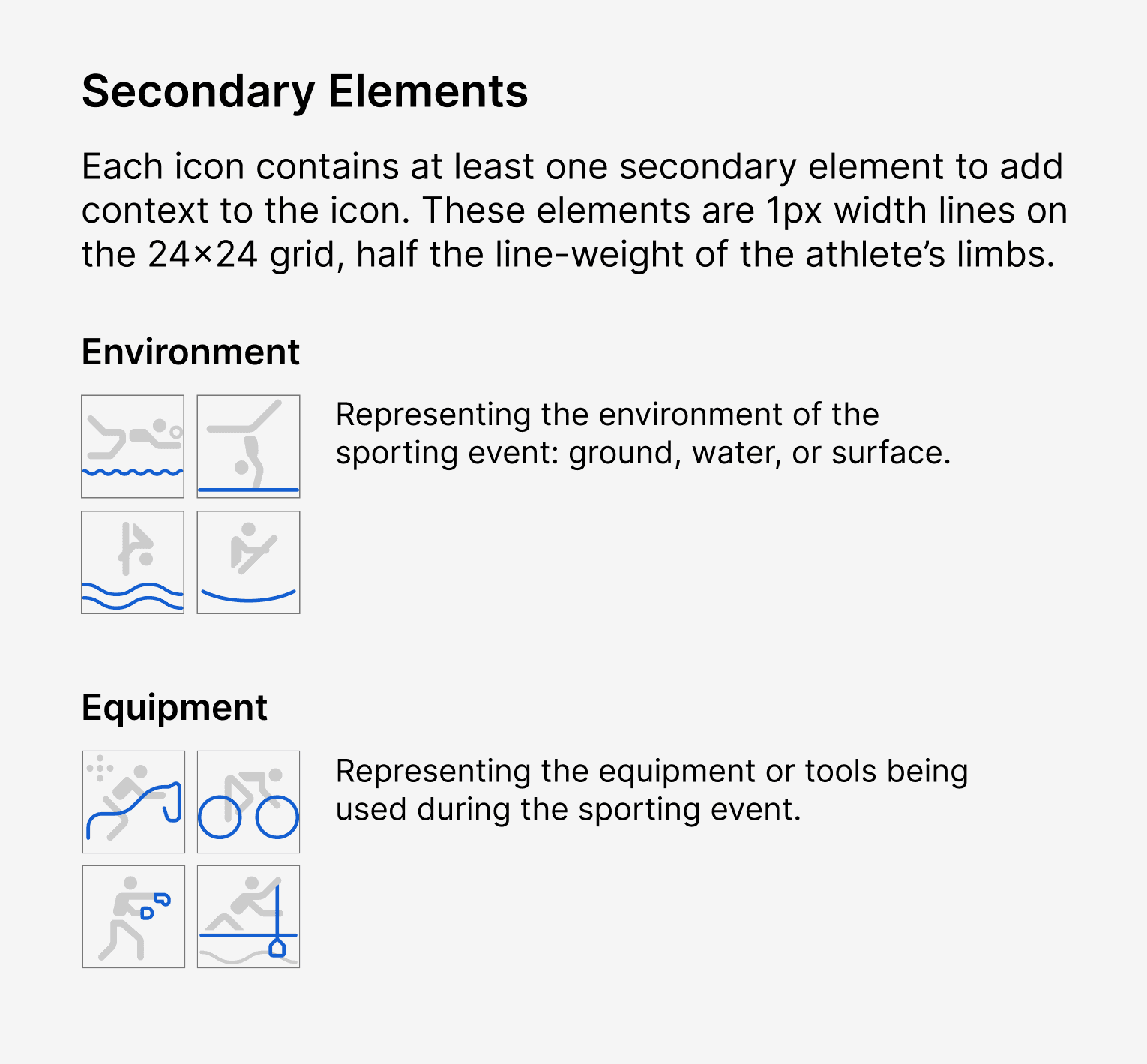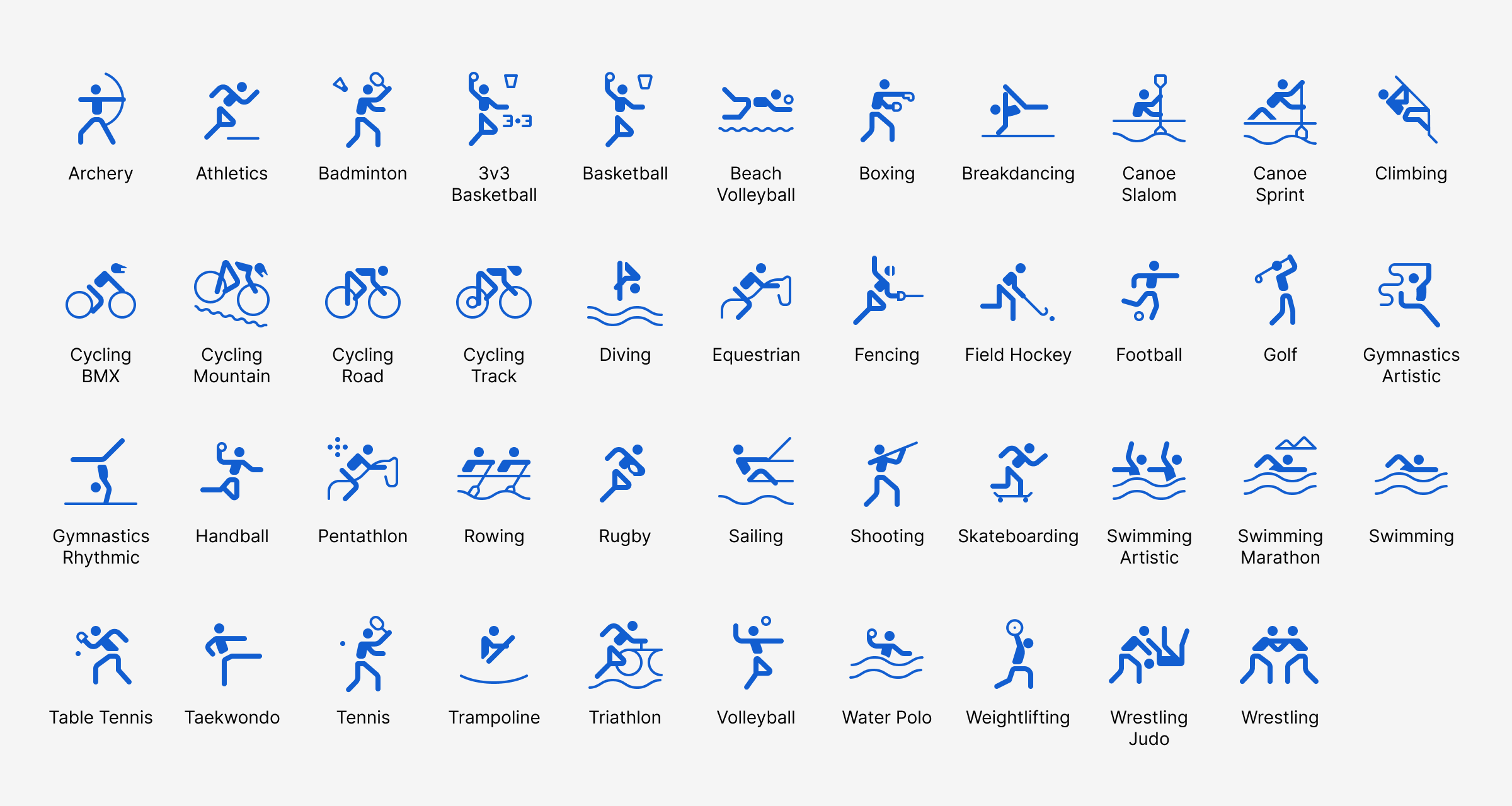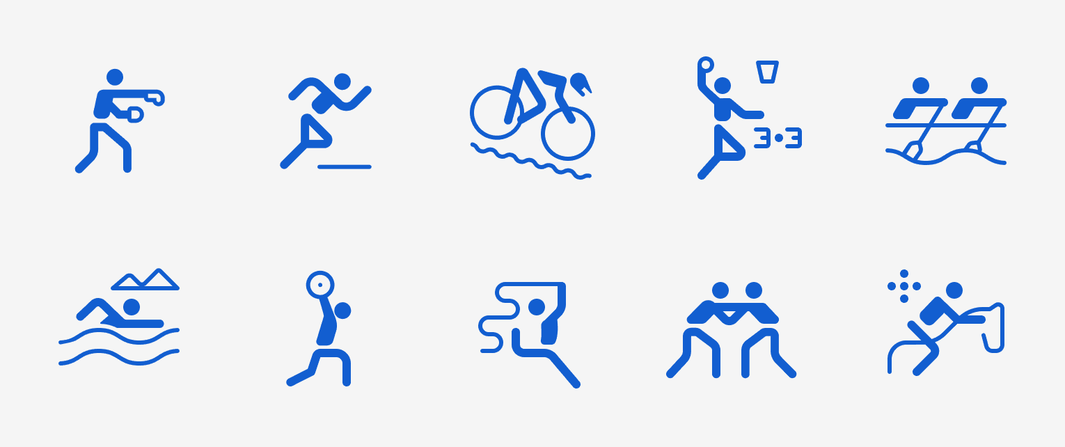 Over 40 icons were created to represent the events of the Summer Olympics. When viewed all up, the icons should hold similar visual weight and align to the same general visual language when it comes to the density and composition of each icon.