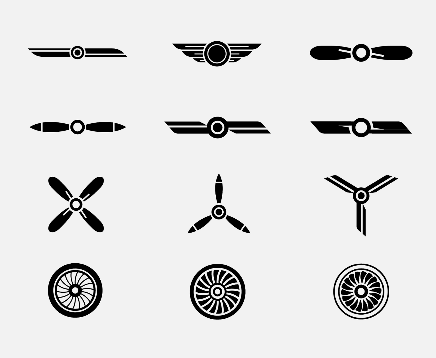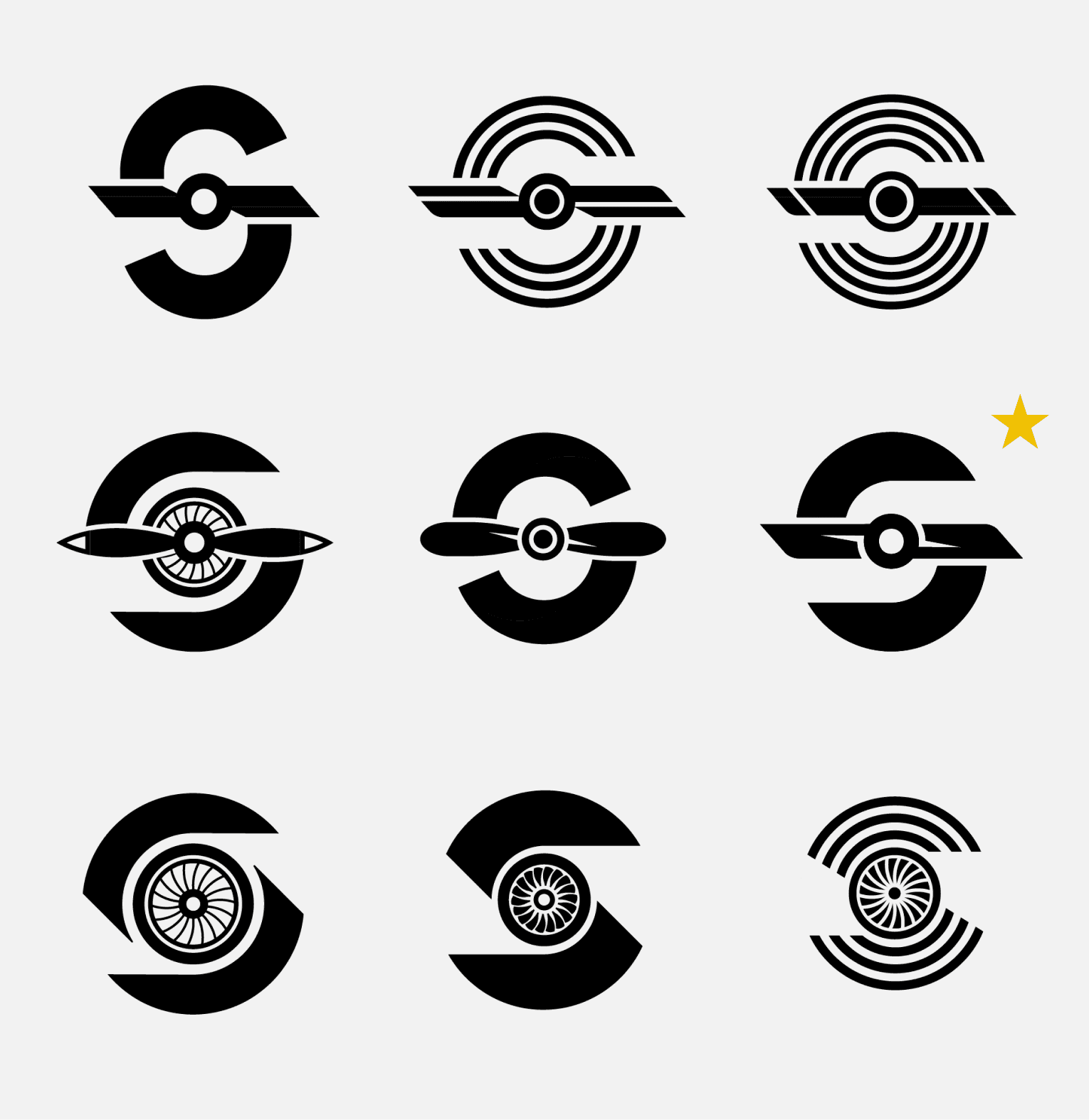 From there I began exploring ways to represent a plane that would live within the center of the logomark, focusing on propellers and jet engines.