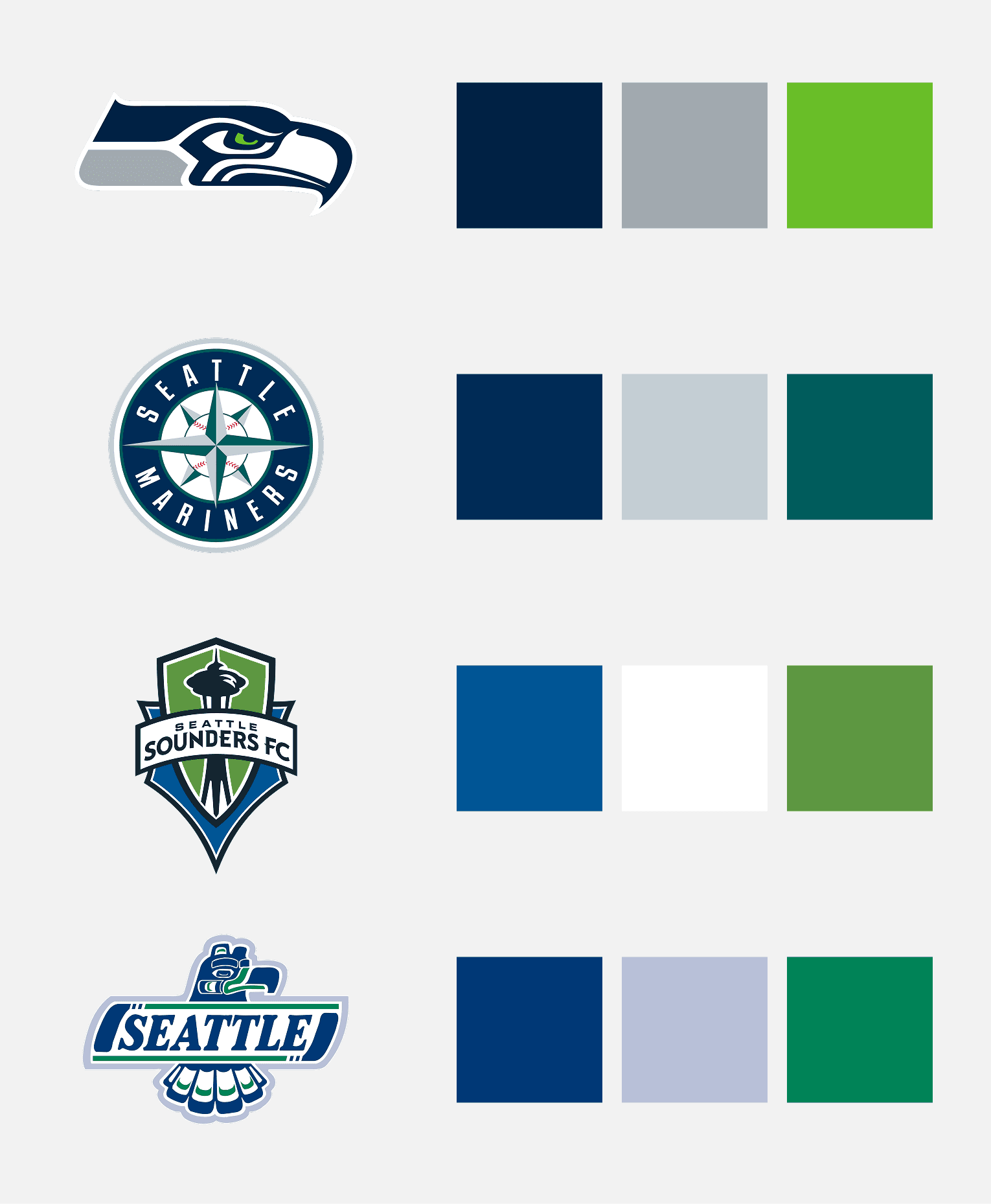A blue/green palette is the unifying theme for teams in Seattle as it ties in with the colors of the region. There are other cities that do a unified color palette across their sports franchises (Pittsburgh being the most notable), and I felt staying consistent with the existing identities in the city would be the best approach for a new pro team.