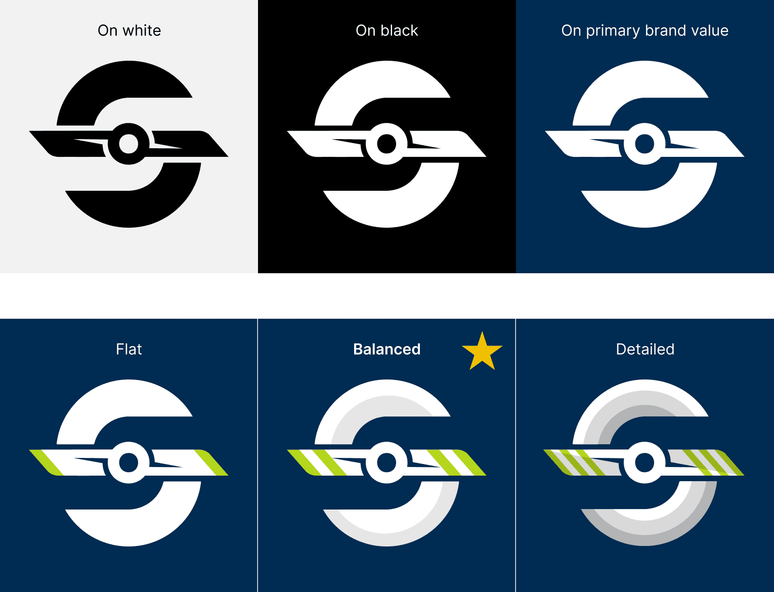 And then began combining the "S" form with the propeller forms in different variations to find the right proportions and level of detail in the flattened mark.